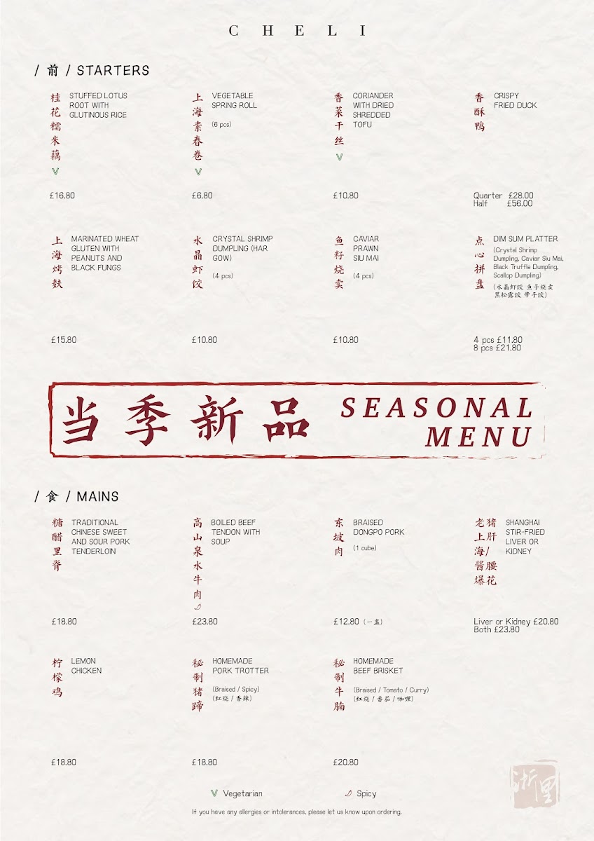 For dessert, indulge in Glutinous Balls in Osmanthus Rice Wine Soup (£12.80) or the refreshing Lychee Mousse (£10.00), both of which promise to elevate your dining experience. Diners rave about the authenticity and creativity of the dishes, making Cheli a recommended spot for lovers of vibrant Chinese flavors. Each plate is a celebration of culinary craftsmanship, catering to both traditionalists and those seeking a modern twist.